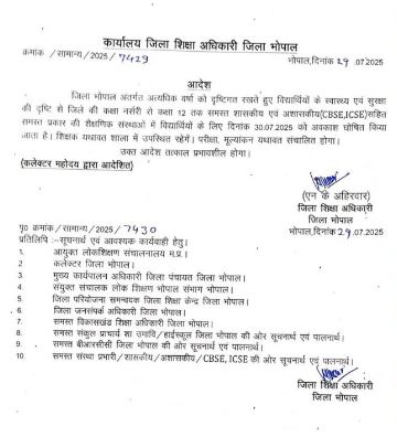 प्रशासन ने कहा लगातार बारिश के कारण भोपाल में 30 जुलाई को कक्षा 12 तक छुट्टी