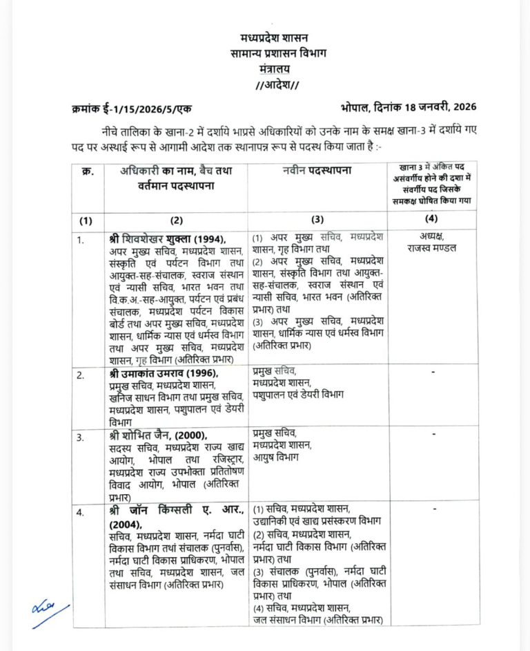 भोपाल। मध्य प्रदेश (Madhya Pradesh) की मोहन सरकार (Mohan Government) ने प्रशासनिक स्तर पर रविवार को बड़ा फेरबदल किया है। शासन ने 26 वरिष्ठ आईएएस (IAS) अधिकारियों के तबादला आदेश जारी कर दिए। इस नई सूची में कई महत्वपूर्ण विभागों के प्रमुख बदले गए हैं। पर्यटन, गृह, स्वास्थ्य और वाणिज्य कर जैसे बड़े विभागों में नए चेहरों की नियुक्ति की गई है, जिससे प्रशासनिक कार्यशैली में बड़े बदलाव की उम्मीद है।