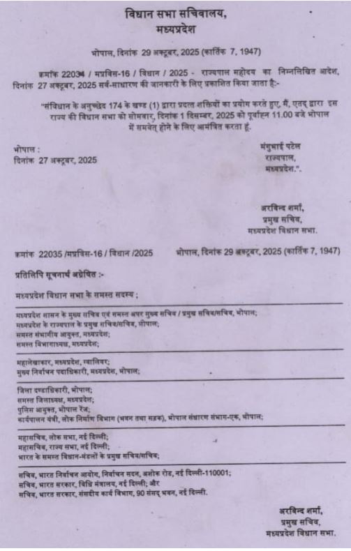 भोपाल। मध्य प्रदेश में 1 दिसंबर से विधानसभा का शीतकालीन सत्र शुरू होगा। यह सत्र पांच दिनों का होगा, जिसको लेकर अधिसूचना जारी कर दी गई है। जिन पर विधानसभा अध्यक्ष विचार करेंगे। वहीं, विधानसभा सचिवालय ने विधायकों को सूचित किया है कि वे विधानसभा से संबंधित किसी भी सूचना को अब विधानसभा अध्यक्ष के बजाय प्रमुख सचिव को संबोधित कर प्रस्तुत करेंगे। विधानसभा के नियम 236 के तहत विधायकों को इस प्रक्रिया से अवगत कराया गया है।