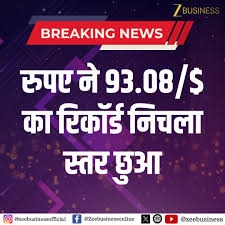 नई दिल्ली। भारतीय रुपया शुक्रवार को शुरुआती कारोबार में कमजोर होकर अपने रिकॉर्ड इंट्रा-डे निचले स्तर पर पहुंच गया। डॉलर के मुकाबले रुपया 19 पैसे टूटकर पहली बार 93 के स्तर को पार करते हुए 93.08 पर कारोबार करता दिखा। इंटरबैंक फॉरेक्स मार्केट में रुपया 92.92 प्रति डॉलर पर खुला और जल्द ही गिरकर 93.08 तक पहुंच गया, जो अब तक का सबसे निचला स्तर है। यह गिरावट पिछले बंद स्तर की तुलना में 19 पैसे की कमजोरी को दर्शाती है। बुधवार को रुपया 49 पैसे गिरकर अमेरिकी डॉलर के मुकाबले रिकॉर्ड निचले स्तर 92.89 पर बंद हुआ।